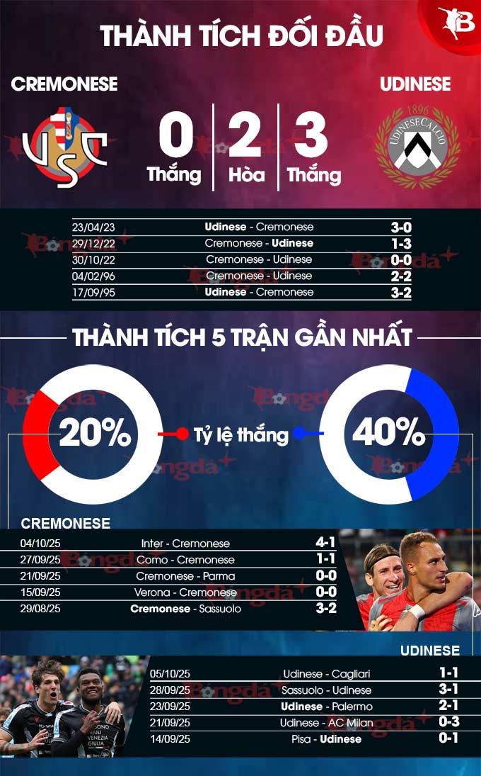 Đối thủ của Cremonese ở trận đấu muộn vòng 7 Serie A là Udinese, đội bóng thi đấu tệ hại trên sân nhà nhưng có màn trình diễn thuyết phục ở những chuyến hành quân xa nhà. Theo thống kê, Udinese đang sở hữu thành tích thắng 5 trong 6 chuyến làm khách gần đây trên mọi đấu trường.