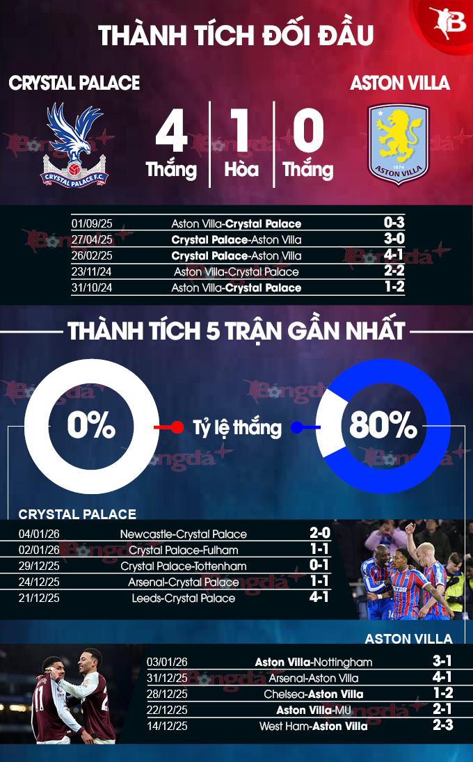 Trước chuyến làm khách tại sân Selhurst Park ở vòng 21 Ngoại hạng Anh, Aston Villa không thắng trận nào ở 6 cuộc đối đầu gần nhất trước đội bóng thành London. Cụ thể, họ thua 5 và hòa 1 trong 6 trận đấu kể trên. Thậm chí, Aston Villa chỉ thắng 2, hòa 1 và thua 9 ở 12 lần gần đây hành quân tới London.