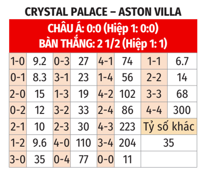 - Tổng bàn thắng là lẻ: 5/6 trận đối đầu gần nhất, 8/12 trận gần đây của Crystal Palace và 10/11 trận vừa qua của Aston Villa đều khép lại với tổng bàn thắng là lẻ. Ngoài ra, 9/10 cuộc đụng độ vừa qua giữa hai đội tại Crystal Palace và 8/9 chuyến làm khách gần đây của Aston Villa cũng có tổng bàn thắng không chia hết cho 2.