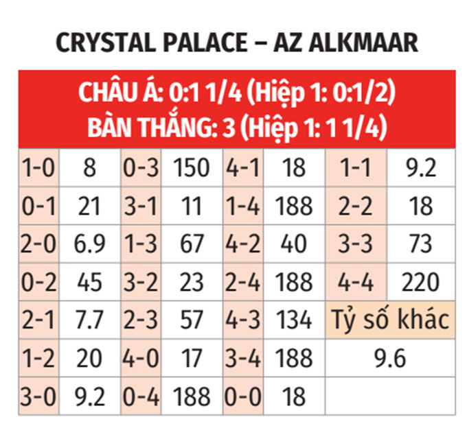 - Crystal Palace thua theo châu Á: Trong 4 trận gần nhất ở Conference League, Crystal Palace thua theo châu Á tới 3 lần. Đá với AZ thắng theo châu Á ở 3/4 trận vừa qua, đội chủ nhà không phải là sự lựa chọn đáng tin cậy.