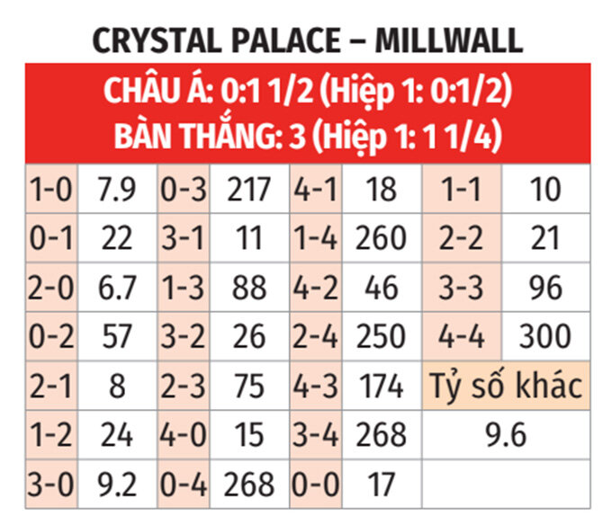 - Millwall thắng theo châu á: Millwall thắng 8/11 trận gần nhất, thắng 7/8 chuyến làm khách gần đây. Còn Crystal Palace thua 4/5 trận vừa qua, thua 5/6 trận sân nhà gần đây. Vì thế, giới mộ điệu có thể đặt niềm tin vào đội khách Millwall lần này.