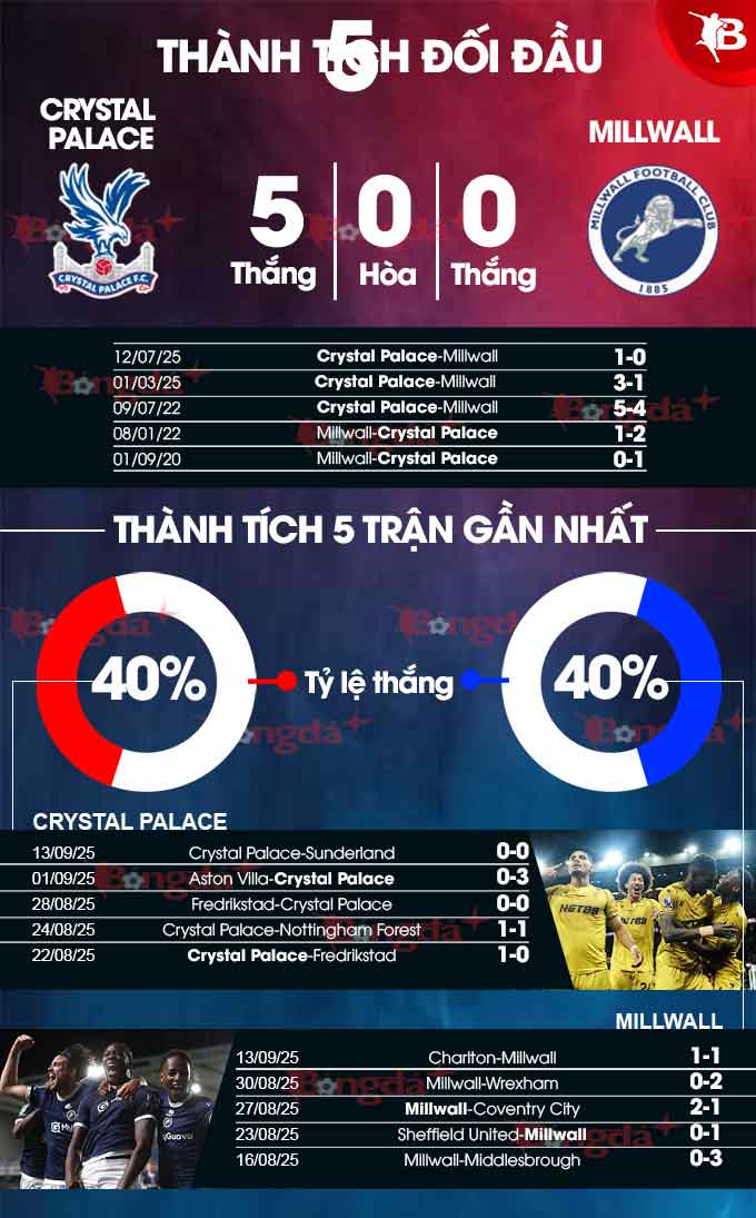 Sân nhà là lợi thế rất lớn của Crystal Palace khi họ bất bại ở 11 trận gần nhất với thành tiichs 5 trận hòa và 6 chiến thắng. Trong khi phong độ gần đây của Millwall lại không mấy ấn tượng với 1 trận hòa, 1 thất bại và 1 chiến thắng ở 3 trận vừa qua trên mọi đấu trường. Xem ra, nhiều khả năng 1 chiến thắng sẽ dành cho chủ nhà Crystal Palace là rất cao.