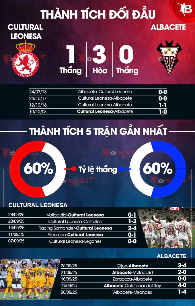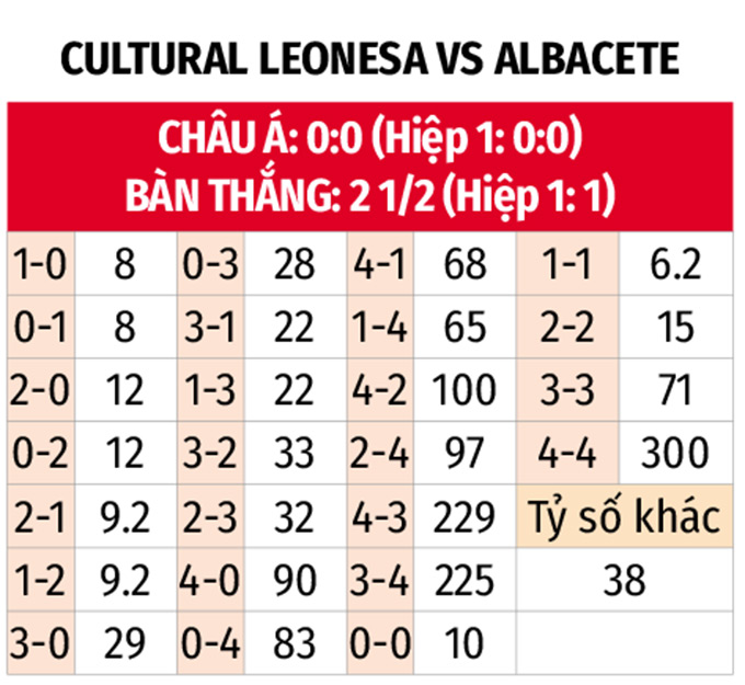 - Khan hiếm bàn thắng: 5/7 trận gần đây của Cultural Leonesa đều kết thúc với tối đa 2 bàn thắng được ghi. Với Albacete, hàng thủ đội khách giữ sạch lưới 3/4 trận vừa qua. Chưa kể, 4 trận đối đầu trong quá khứ có tối đa 2 pha làm bàn.