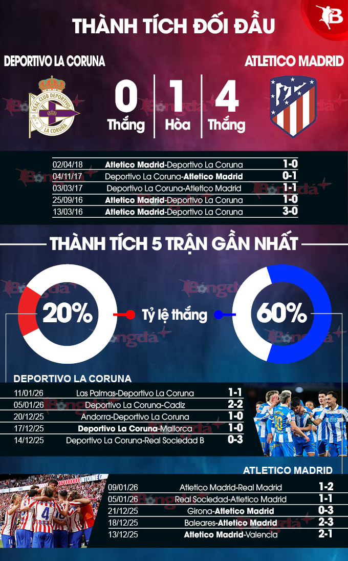 Xét về thành tích đối đầu, có thể khẳng định Atletico chắc chắn là "hung thần" với Deportivo. Nếu ai đó còn nghi ngờ về chuyện này thì họ nên biết, đại diện thủ đô Tây Ban Nha đã bất bại 14 trận liền trước con mồi ưa thích của mình. Riêng ở 5 lần chạm trán Atletico gần đây, Deportivo thua đến 4 lần và đó đều là những trận họ không ghi nổi dù chỉ là một bàn thắng. Khi lịch sử hoàn toàn chống lại Deportivo như vậy, sẽ là bất ngờ nếu họ vượt qua được Atletico để giành vé đi tiếp.