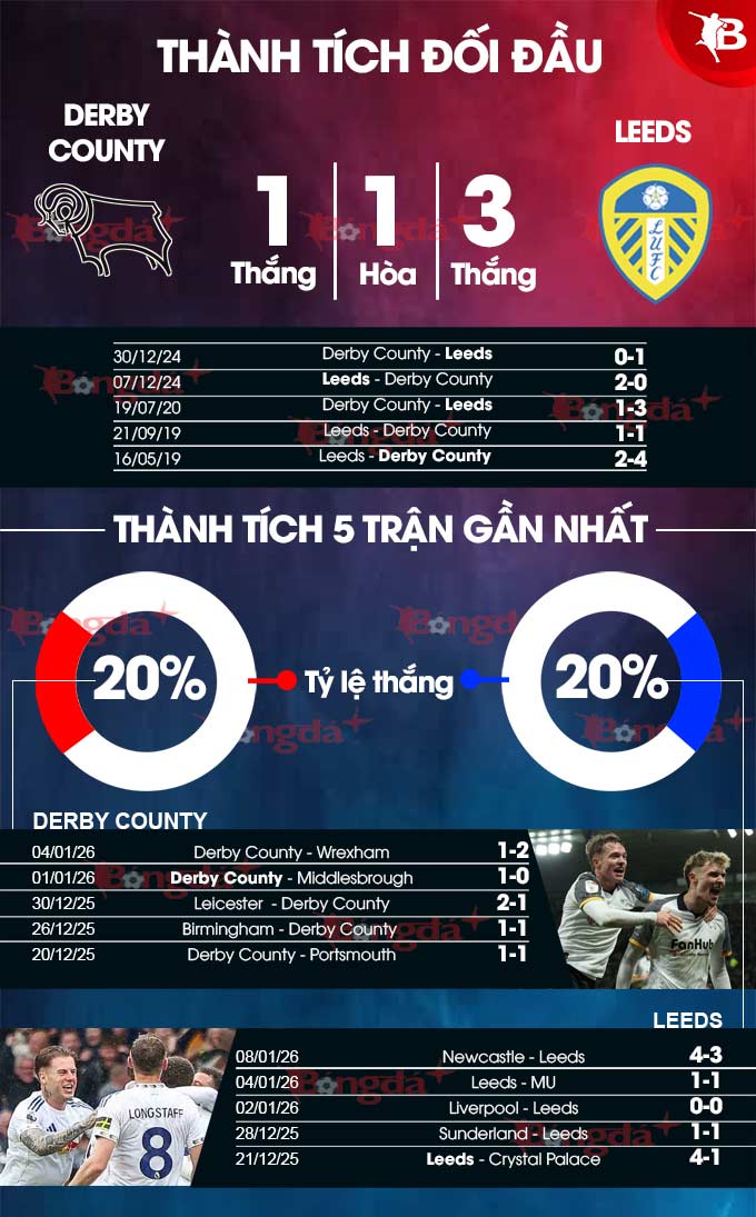 Tuy nhiên, trước trận đấu này, Derby chỉ thắng 1, hòa 2 và thua 2 ở 5 trận gần nhất. Điều này khiến sự tự tin trước Leeds ở vòng 3 FA Cup có phần giảm sút. Ngoài ra, họ cũng thi đấu không ổn định trên sân nhà thời gian quan. Họ thắng 1, hòa 2 và thua 3 ở 6 trận vừa qua. Thậm chí, trên sân nhà, Derby thua 4, hòa 1 ở 5 lần gần nhất đón tiếp Leeds.