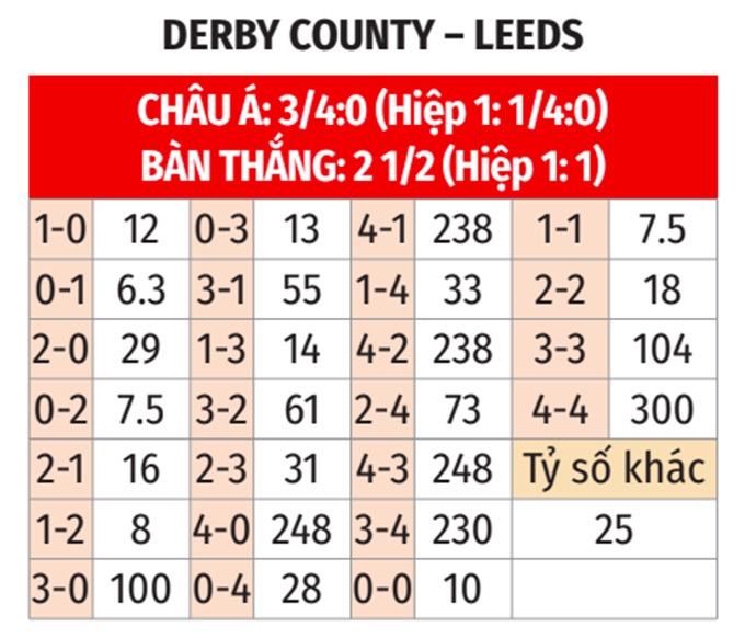 - Leeds thắng theo châu Á: Leeds thắng 5/7 cuộc đối đầu gần nhất; thắng 6/9 trận gần đây; thắng 3, hòa 1 và chỉ thua 1 ở 5 chuyến làm khách vừa qua. Còn Derby County thua 6/9 trận gần nhất; thua 4, hòa 1/6 trận sân nhà vừa qua. Do đó, giới mộ điệu có thể đặt niềm tin vào Leeds ở trận này.