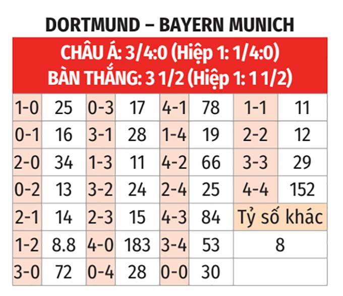 • Trên 3 bàn: 8/10 trận sân khách gần đây của Bayern đều có trên 3 bàn. 3/4 trận gần nhất của Dortmund số bàn thắng cũng chạm tới ngưỡng 4.