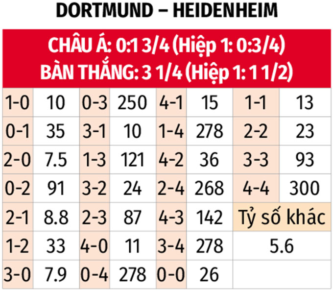 - Dortmund thắng theo châu Á hiệp 1: Lịch sử đối đầu chứng kiến Dortmund thắng theo châu Á 4/5 trận gần nhất gặp Heidenheim trong hiệp thi đấu đầu tiên. Tại Bundesliga, Dortmund cũng đang nhập cuộc rất tốt với 3 trận liên tiếp vừa qua đều thắng theo châu Á hiệp 1.