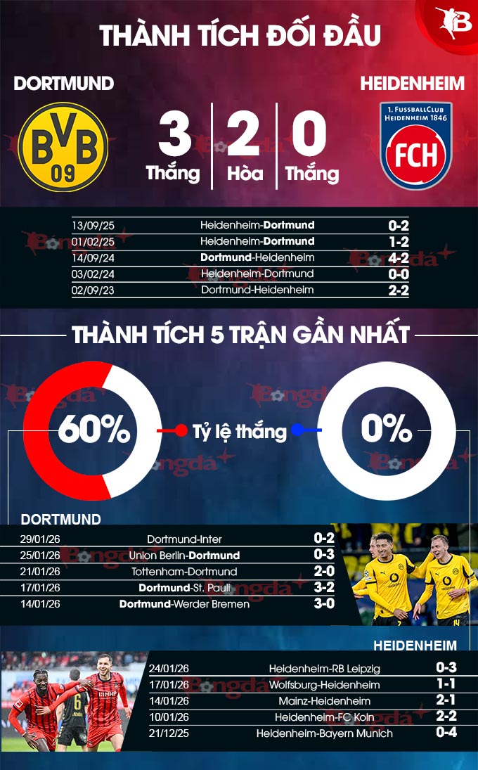 - Từ 2 đến 3 bàn thắng: 6/8 trận gần đây của Dortmund cùng 7/9 trận vừa qua của Heidenheim đều kết thúc với từ 2 đến 3 lần lưới rung. Lịch sử cũng chứng kiến 2 trận gặp nhau gần nhất có từ 2 đến 3 bàn thắng được ghi.