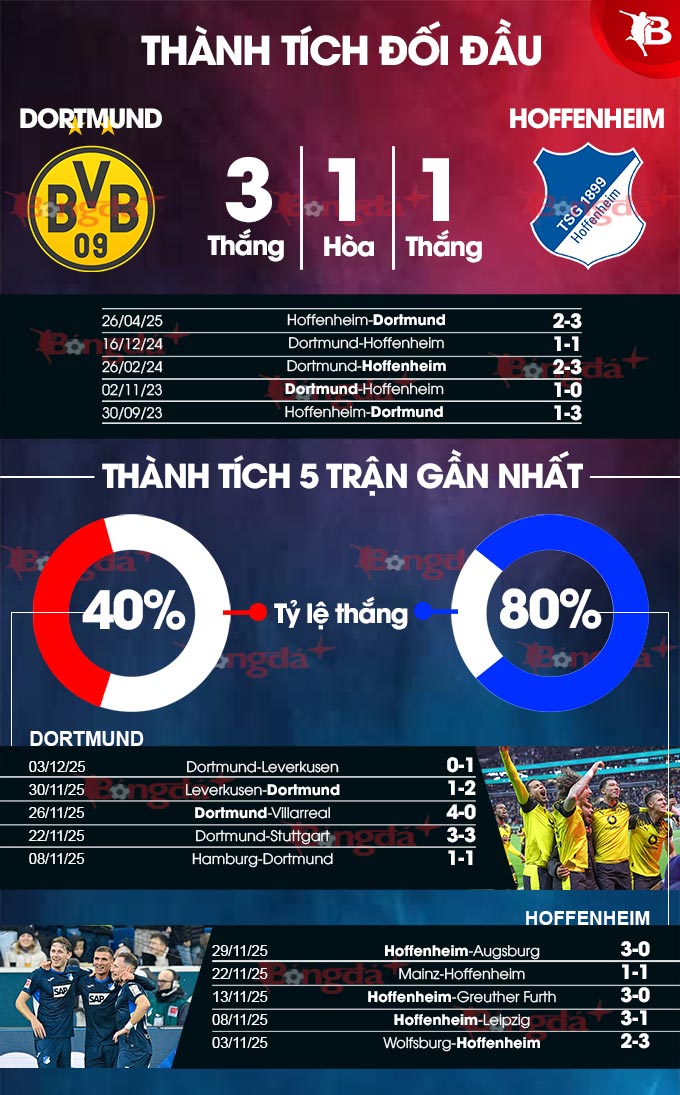 - Hai đội cùng ghi bàn: 7/10 cuộc đối đầu gần nhất, 9/13 trận gần đây của Dortmund và 5/6 trận chính thức vừa qua của Hoffenheim đều khép lại với ít nhất 1 bàn thắng cho mỗi đội. Ngoài ra, Dortmund luôn ghi bàn ở 13/14 trận sân nhà gần đây và 6/7 chuyến làm khách vừa qua của Hoffenheim đều khép lại mà không đội nào giữ sạch lưới nhà.
