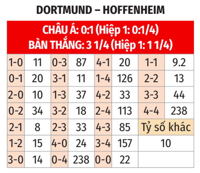 - Dortmund ghi bàn hiệp 1: Dortmund ghi ít nhất 1 bàn trong hiệp 1 ở 7/8 cuộc đối đàu nhất, ở 5/8 lần gần nhất đón tiếp Hoffenheim trên sân nhà. Ngoài ra, họ cũng ghi được bàn trong hiệp 1 ở 3/4 trận vừa qua, ở 6/8 trận sân nhà vừa qua. Trận này khó có ngoại lệ.
