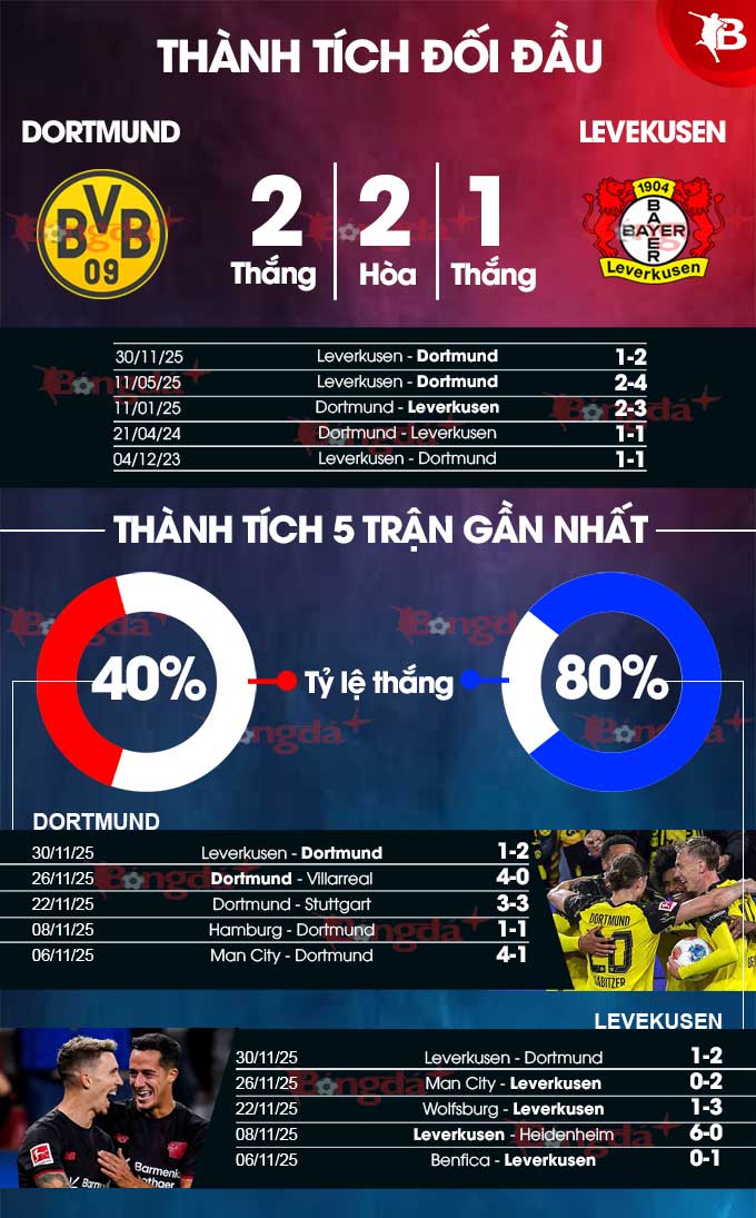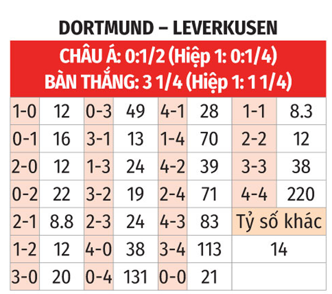 - Chẵn bàn thắng: 4/6 trận so T gần đây giữa 2 đội có tổng bàn thắng chia hết cho 2. Ngoài ra, 3/4 trận vừa qua của Dortmund lẫn Leverkusen đều chứng kiến điều tương tự.