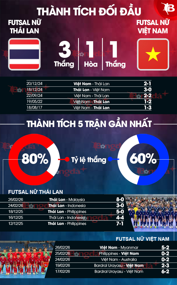 Phân tích phong độ ĐT futsal nữ Thái Lan vs ĐT futsal nữ Việt Nam