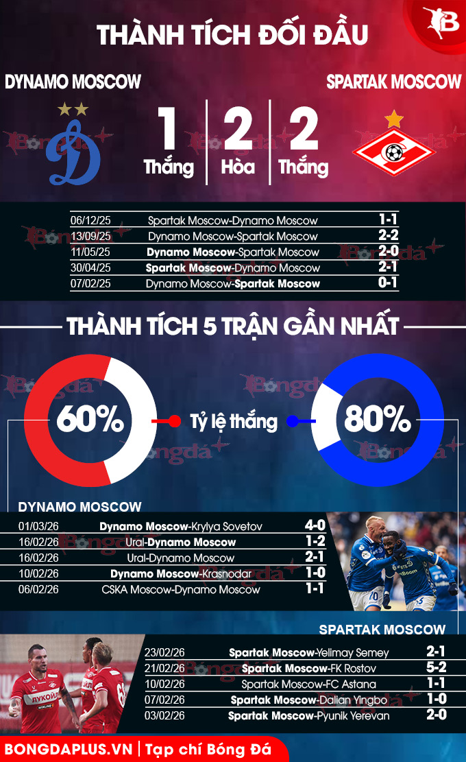 Bây giờ, Dynamo Moscow và Spartak Moscow sẽ phải tạm gác lại giải VĐQG để hướng tới bán kết lượt đi Cúp quốc gia Nga 2025/26. Lúc này, phong độ của đôi bên không có sự chênh lệch, khi chỉ thua 1/5 trận gần nhất.