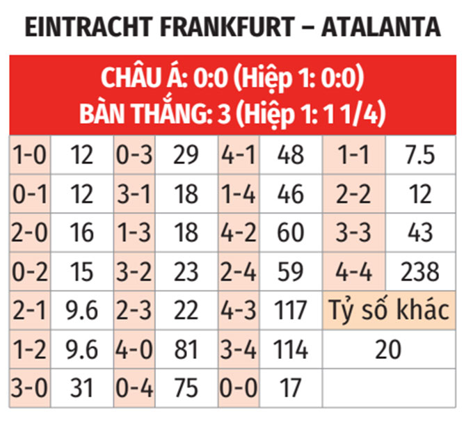 - Tỷ số chẵn: 6/8 trận gần nhất của Eintracht Frankfurt kết thúc với tỷ số chẵn. 2 cuộc đụng độ trước đây giữa đội bóng này và Atalanta cũng có số bàn thắng chia hết cho 2.