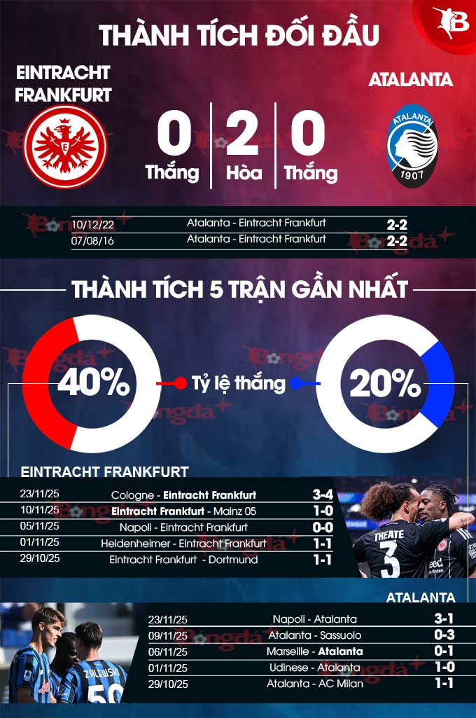Trong quá khứ, Eintracht Frankfurt từng đụng độ Atalanta 2 lần và cả 2 trận đều kết thúc với tỷ số hòa. Gặp lại Atalanta rất có duyên trên sân khách, sẽ chẳng dễ để Eintracht Frankfurt phá dớp thường xuyên không thắng nổi các đại diện Italia.