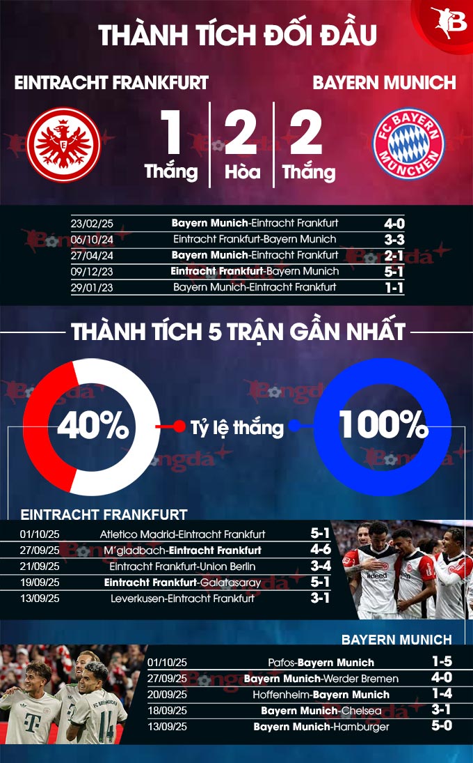 - Ít nhất 2 bàn hiệp 1: 9/10 trận đã đấu của Eintracht Frankfurt đều có tối thiểu 2 bàn thắng trong hiệp 1. Bên phần sân đối diện, 5/6 trận vừa qua của Bayern Munich cùng 3/4 trận đối đầu gần nhất cũng xuất hiện tối thiểu 2 bàn trước giờ nghỉ.