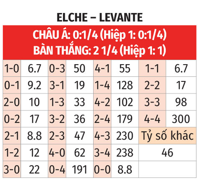 - Chẵn bàn thắng: 3/5 trận đối đầu vừa qua giữa Elche vs Levante có tổng bàn thắng chia hết cho 2. Ngoài ra, 4/5 trận sân nhà vừa qua của Elche và 3/5 trận mới đây của Levante đều chứng kiến điều tương tự.