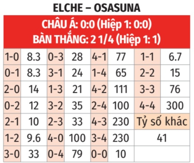 - Tối thiểu 3 bàn cả trận: 9/11 trận đấu gần đây của Elche kết thúc với ít nhất 3 bàn thắng. Tình trạng tương tự xảy ra ở 5 trận gần nhất của Osasuna.