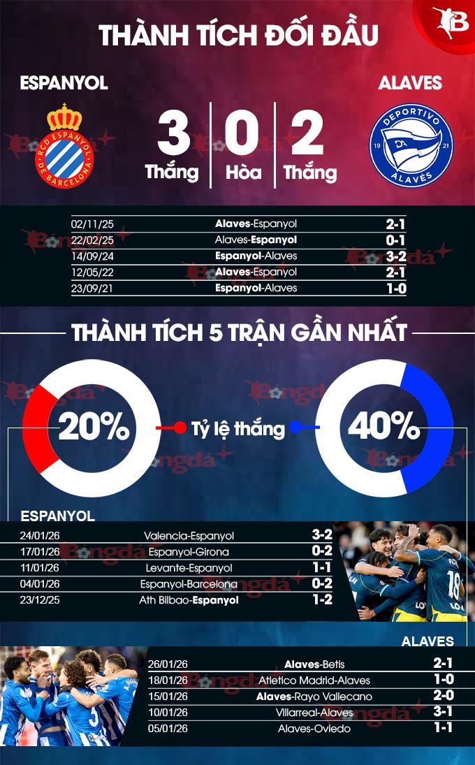 Tuy nhiên, Espanyol có cơ hội để chấm dứt mạch trận đáng thất vọng ở vòng đấu này. Họ hiện có thành tích 6 chiến thắng, 1 trận hòa, 4 trận thua trong 11 trận sân nhà ở La Liga mùa này, và sẽ tiếp đón Alaves - đội có thành tích sân khách tệ nhất giải đấu, chỉ giành 4 điểm sau 10 trận. Chưa kể, Espanyol cũng đã thắng 4 trong 6 trận đấu gần nhất tại giải vô địch quốc gia trước Alaves.