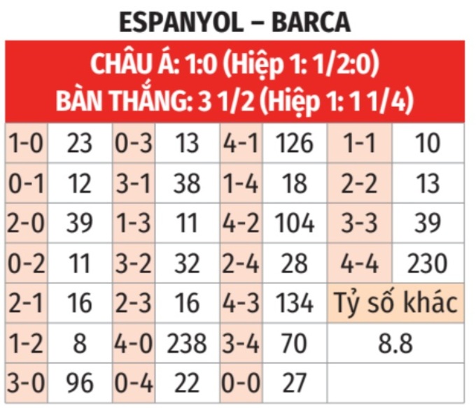 - Tối đa 1 bàn hiệp 1: 6/7 trận đấu gần đây của Espanyol chỉ xuất hiện nhiều nhất 1 bàn thắng trong hiệp 1. Tình trạng tương tự xảy ra ở cả 4 trận vừa qua của Barca.
