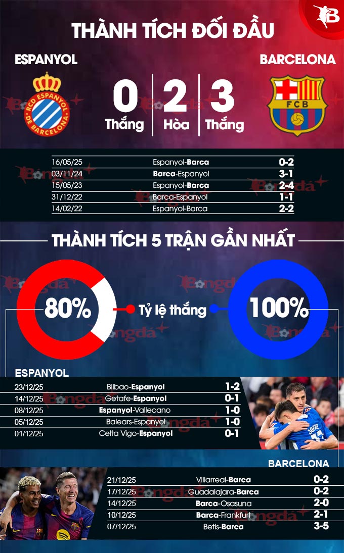 Trong quá khứ, Barca thường áp đảo khi đến thi đấu trên sân của Espanyol. Bằng chứng là trong 16 lần gần nhất đến làm khách ở RCDE, đội chủ sân Camp Nou thắng 9 và hòa 7 trận. Nhưng bây giờ, Espanyol đang “vào phom” và được xem là hiện tượng ở La Liga mùa này, nên Barca sẽ không dễ thắng.