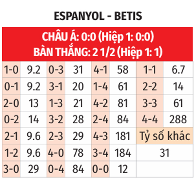 - Chẵn bàn thắng: 5/7 trận đối đầu gần nhất của Espanyol có tổng bàn thắng không chia hết cho 2. Ngoài ra, 5 trận vừa qua của Betis chứng kiến điều tương tự.