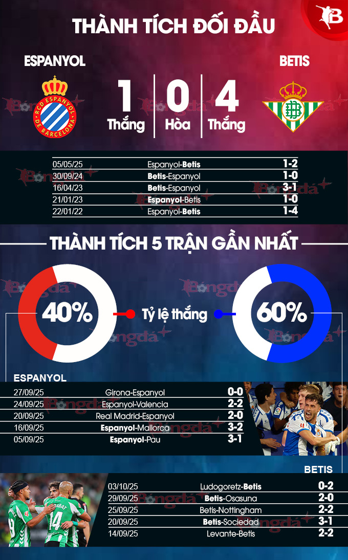 Chiều ngược lại, Betis cũng có kết quả tương tự trên sân khách. Điểm tựa để Betis tin vào chiến thắng trước Espanyol là phong độ vào lúc này và đặc biệt, thành tích đối đầu vượt trội.
