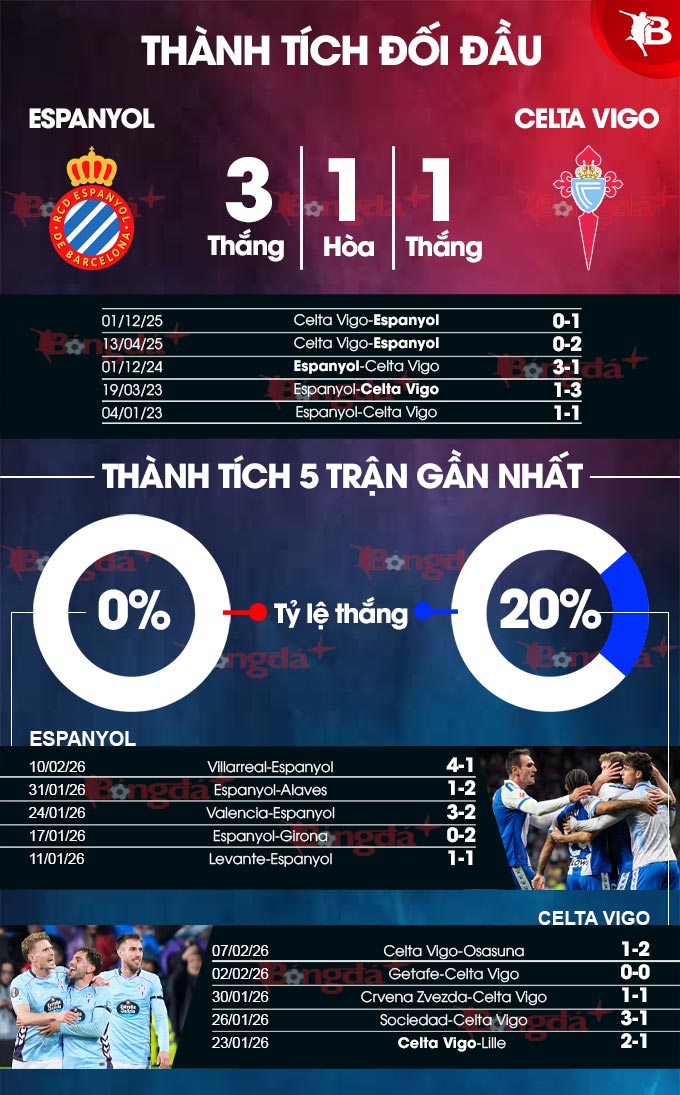 Đặc biệt, Espanyol có sự ủng hộ của quá khứ. Thống kê chỉ ra rằng, trong cả 3 lần chạm trán gần đây nhất giữa 2 đội, đội bóng xứ Catalunya đều giành chiến thắng. Gần đây nhất, Espanyol đánh bại Celta Vigo 1-0 ở trận lượt đi tại La Liga mùa này nhờ pha lập công duy nhất của Kike.