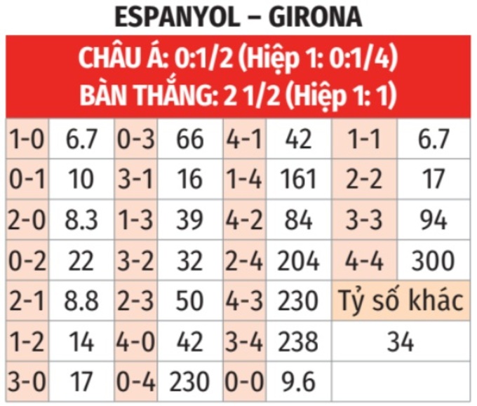 - Tối đa 1 bàn hiệp 1: 8/9 lần đối đầu giữa 2 đội gần đây chỉ có nhiều nhất 1 bàn thắng trong hiệp 1. 8/9 trận gần đây của Espanyol và 10/12 trận vừa qua của Girona xảy ra tình trạng tương tự.