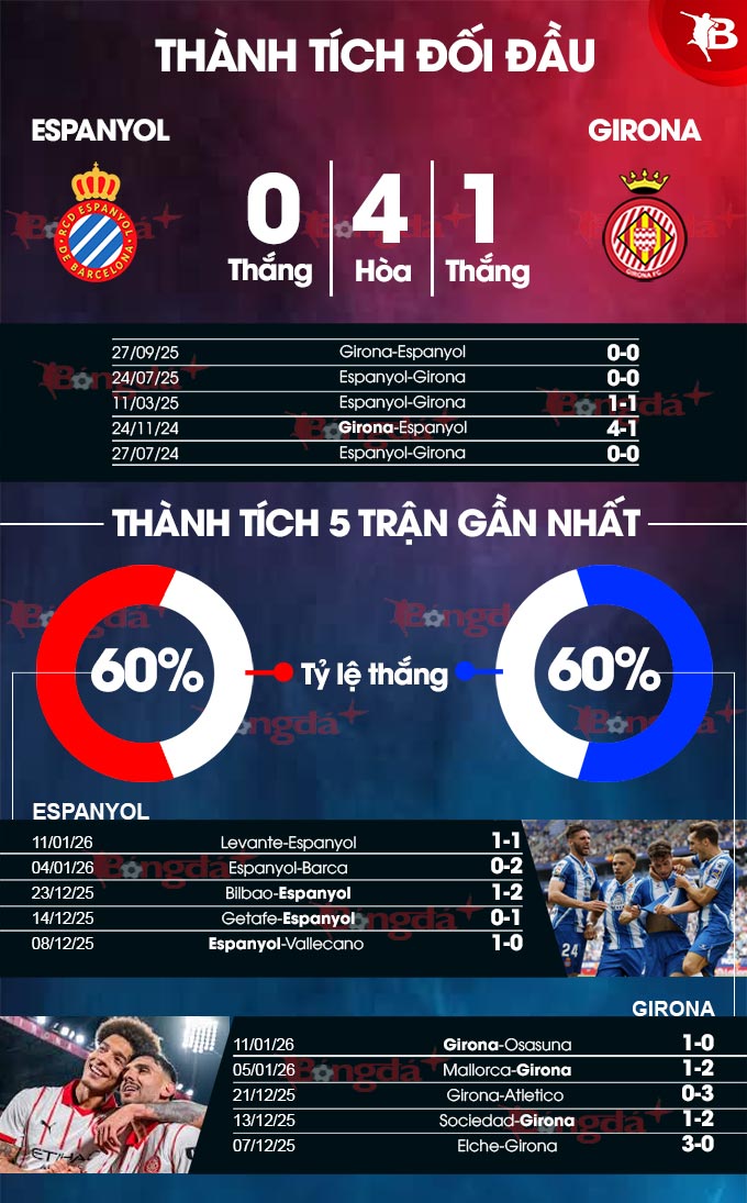 Tuy nhiên, quyết tâm giành chiến thắng của Espanyol là không dễ để thực hiện. Nên nhớ rằng, trong 8 lần chạm trán giữa 2 đội gần đây, Girona áp đảo. Cụ thể, họ thắng 4 và hòa 4 trận. Trong đó, thành tích của Girona trên sân RCDE của Espanyol trong 6 chuyến hành quân trở lại đây là thắng 3 và hòa 3 trận.