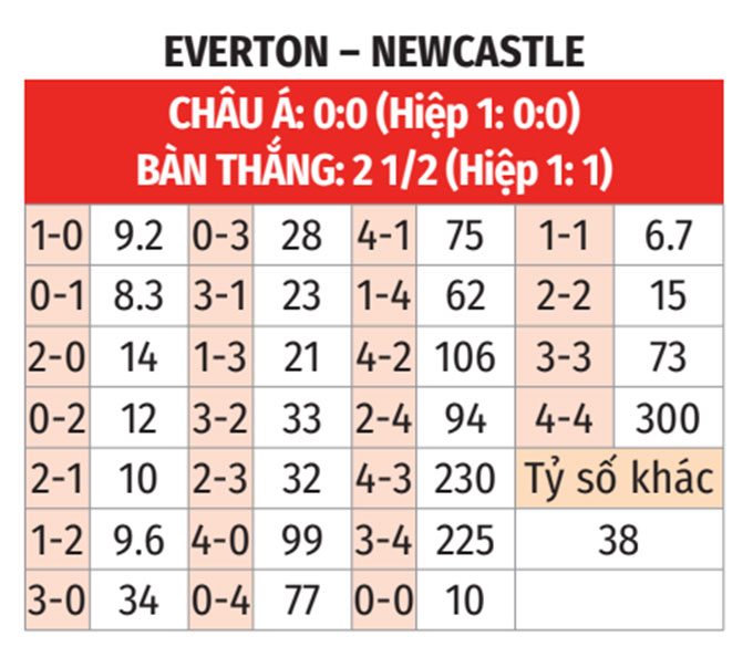 - Dưới 3 bàn: Cả 3 trận gần đây của Everton đều có dưới 3 bàn. 3 trận gần nhất giữa đội bóng này và Newcastle số lần lưới rung cũng không hơn được 2.