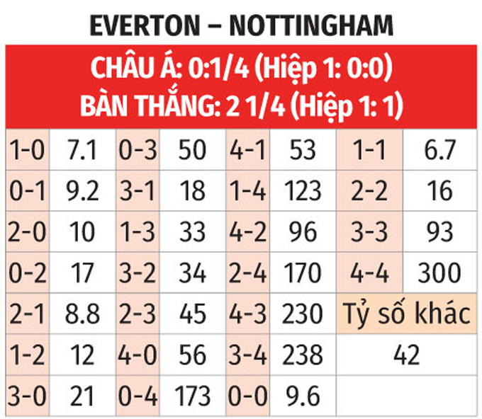 - Chẵn bàn thắng: 5/7 trận đối đầu trước đó giữa Everton vs Nottingham có tổng bàn thắng chia hết cho 2. Ngoài ra, 11/15 trận sân nhà vừa qua của Everton và 6/10 trận gần đây của Nottingham đều chứng kiến điều tương tự.