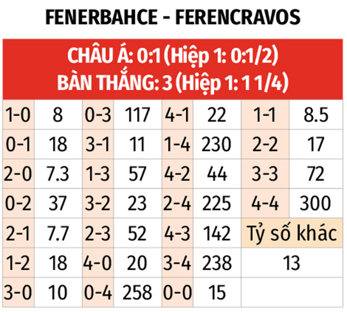- Tối thiểu 2 bàn hiệp 1: 5/7 vừa qua của đội chủ nhà Fenerbahce kết thúc với tối thiểu 2 bàn thắng trong 45 phút đầu tiên. Bên kia chiến tuyến, 4/6 trận gần nhất của Ferencvaros cũng xuất hiện ít nhất 2 tình huống làm bàn.
