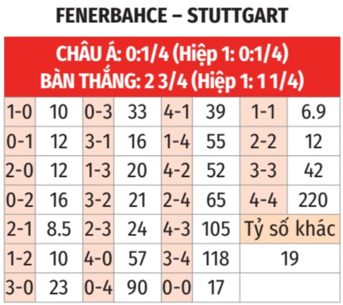 - Tối thiểu 2 bàn hiệp 1: 4/5 trận đấu gần đây của Fenerbahce tại các giải đấu Cúp đều có từ 2 bàn thắng trở lên trong hiệp 1. 8/12 trận vừa qua của Stuttgart trên sân khách xảy ra tình trạng tương tự.