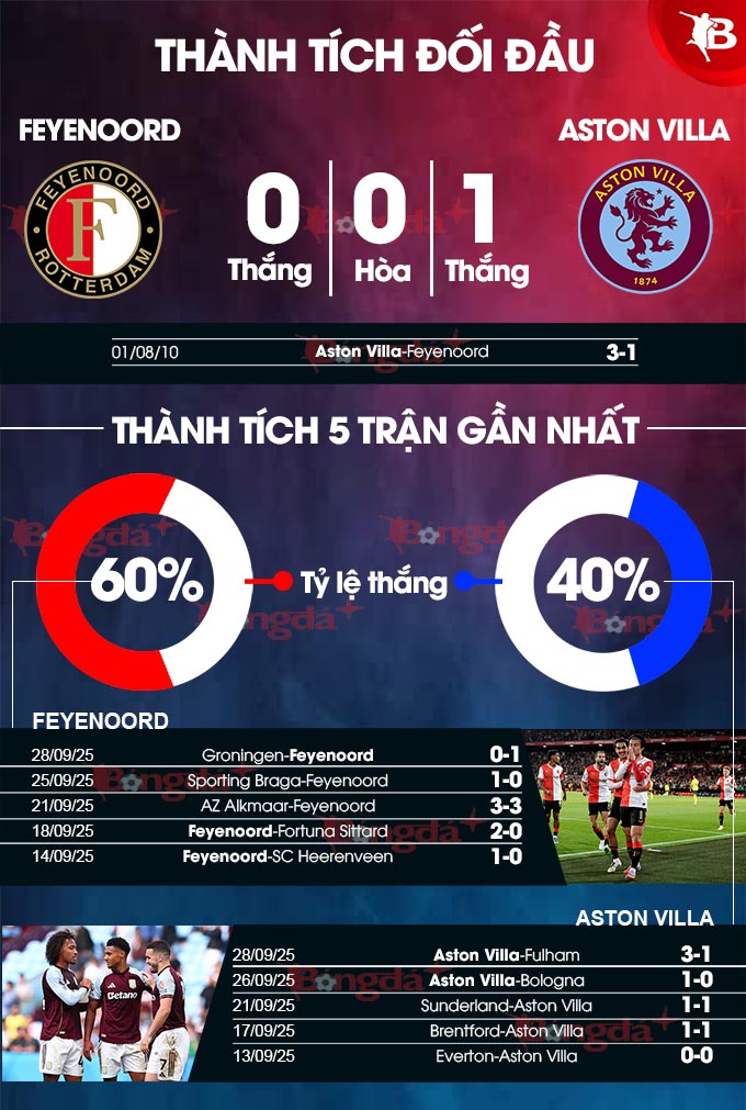 Về phần Aston Villa, đội bóng này lại không phải nhận thất bại nào trong 5 trận gần nhất đối mặt với những đối thủ Hà Lan (thắng 4, hòa 1). Cũng may cho Feyenoord là Aston Villa đang có chuỗi 5 trận không thắng trên sân khách liên tiếp. Căn cứ vào thực tế trên, nếu trận đấu tới có bất phân thắng bại thì xem ra đây cũng là kết quả hợp lý.