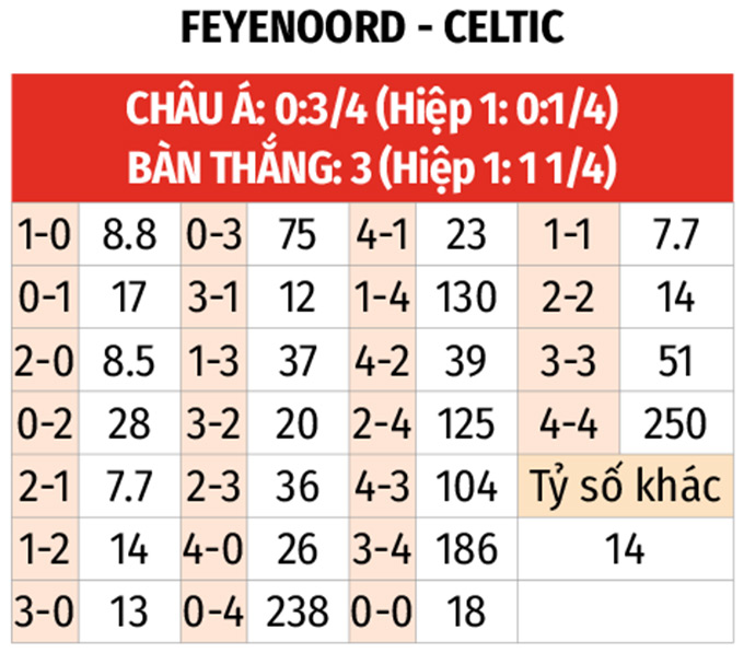 - 3 bàn thắng trở lên: 7/8 trận gần đây của Feyenoord cùng 5/7 trận vừa qua của Celtic đều có ít nhất 3 bàn thắng được ghi. 2/3 trận đối đầu gần nhất cũng xuất hiện tối thiểu 3 pha làm bàn.