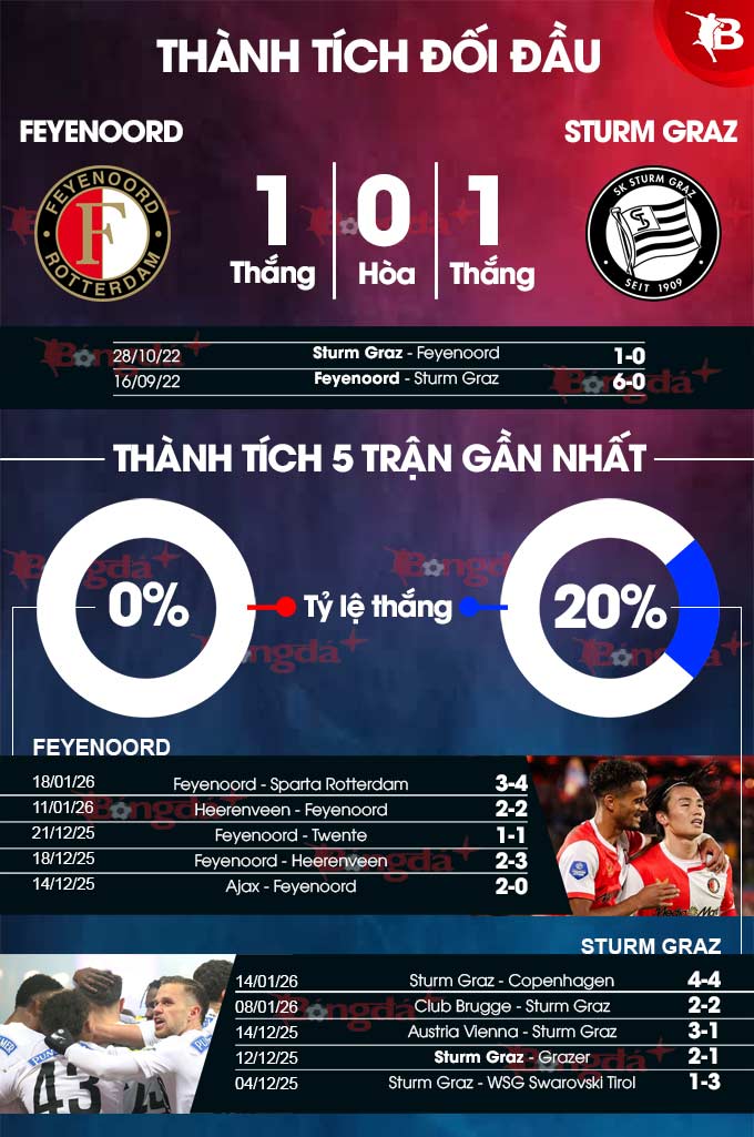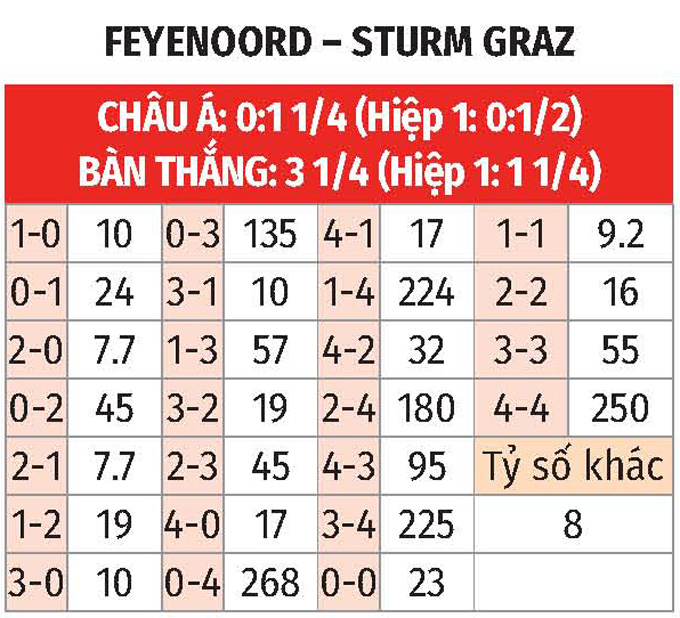 - Lưới rung 15 phút cuối: 3/4 trận so T trước đây giữa đôi bên có bàn thắng từ phút 75 trở đi. Chưa hết, 5 trận đã qua của Feyenoord lẫn 5/7 trận vừa xong của Sturm Graz cũng chung kịch bản.