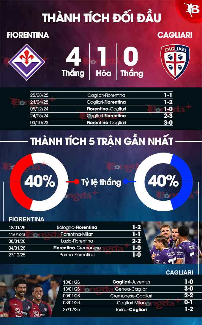 Cagliari thua toàn bộ 4 lần gần nhất đến làm khách trên sân Artemio Franchi của Fiorentina, thậm chí đội bóng đảo Sardegna còn không ghi nổi bàn thắng nào. 3 điểm dành cho Fiorentina là điều không cần bàn cãi.