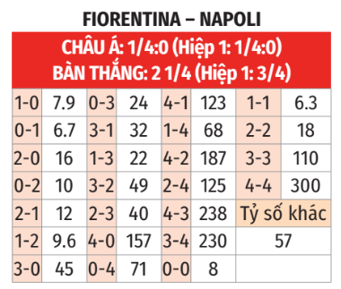 - X góc hiệp 1: 6/7 trận Serie A gần đây của Napoli chỉ có tối đa 3 góc trong 45 phút đầu. 9/11 trận Serie A vừa của Fiorentina với theo châu á từ 0 đến 1/2 trái về X góc hiệp 1. 8/9 lần đối đầu gần nhất giữa đôi bên ở Serie A và Coppa Italia chỉ có tối đa 4 góc hiệp 1.