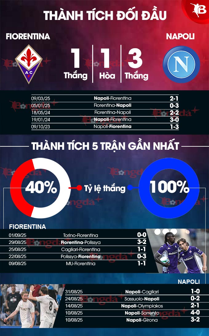 Napoli chỉ thua đúng 1/16 lần gần nhất chạm trán Fiorentina trên sân khách ở Serie A (thắng 8, hòa 7). Trớ trêu thay, đó là trận thua 0-3 cuối mùa 2017/18 khiến Napoli mất Scudetto vào tay Juventus.