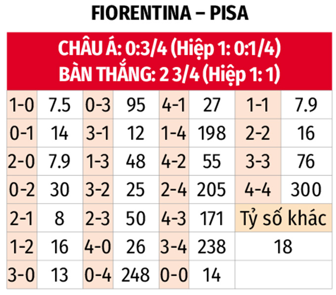 • Từ 4 góc trở lên trong hiệp 1: 5/7 trận gần đây của Fiorentina cùng 4/6 trận vừa qua của Pisa xuất hiện tối thiểu 5 quả phạt góc trong 45 phút đầu tiên. Trận đối đầu ở lượt đi cũng có 4 quả góc trước khi hai đội bước vào giờ nghỉ.