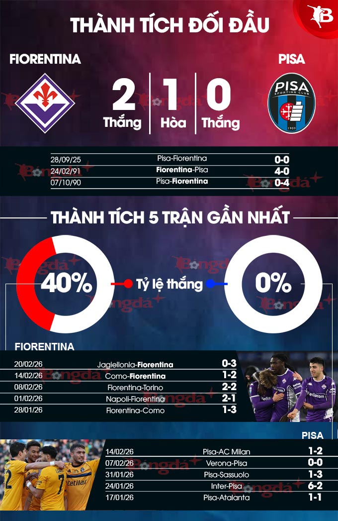 Nhận định bóng đá trận Fiorentina vs Pisa diễn ra vào lúc 00h30 ngày 24/2 ở vòng 26 Serie A. BongdaPlus phân tích thông tin lực lượng, đội hình dự kiến, dữ liệu chuyên sâu, dự đoán tỉ số.