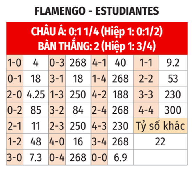 - T hiệp 1: 8/9 trận gần nhất của Flamengo và 4/5 trận vừa qua của Estudiantes đều có ít nhất 1 bàn trong hiệp 1. Hơn nữa, 3/4 trận sân nhà gần đây của Flamengo và 6/9 chuyến làm khách vừa qua của Estudiantes cũng đều chứng kiến ít nhất 1 lần lưới rung hiệp 1.
