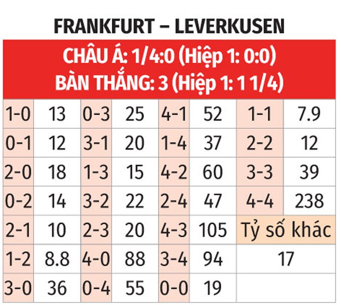 - Frankfurt ghi bàn hiệp 1: Frankfurt đã ghi ít nhất 1 bàn trong hiệp 1 ở 5/6 trận gần nhất. Chưa hết, Frankfurt còn làm được điều đó trong 3/4 lần so T gần đây với Leverkusen trên mọi đấu trường.