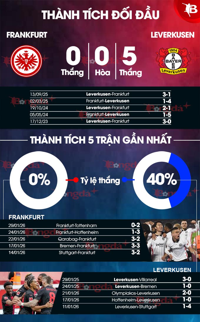 Leverkusen và Frankfurt vừa trải qua loạt trận cuối vòng phân hạng Champions League 2025/26 với kết cục khác nhau. Trong khi Frankfurt bị loại thì Leverkusen sẽ đá play-off. Đó được xem là động lực cho Leverkusen trong chuyến hành quân tới sân của Frankfurt ở vòng 20 Bundesliga.