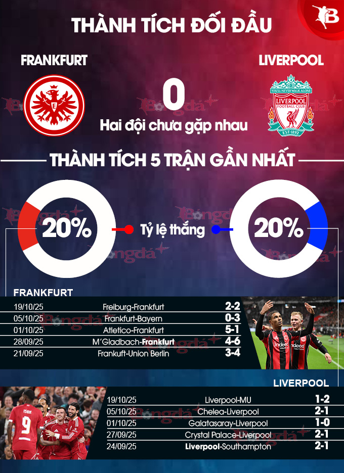 Giống như Liverpool, Frankfurt cũng không thắng trận gần nhất tại giải VĐQG, nhưng sự khác biệt là đội bóng Đức lại giành được 1 điểm. Dù vậy, đánh giá tổng thể thì Liverpool và Frankfurt đang có phong độ tương tự nhau khi chỉ thắng 1/5 trận gần nhất.