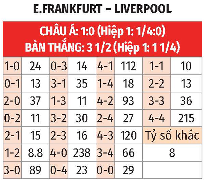 - Lẻ bàn thắng: 3/4 trận sân nhà gần nhất của Frankfurt có tổng bàn thắng không chia hết cho 2. Ngoài ra, 6/7 trận vừa qua của Liverpool chứng kiến điều tương tự.