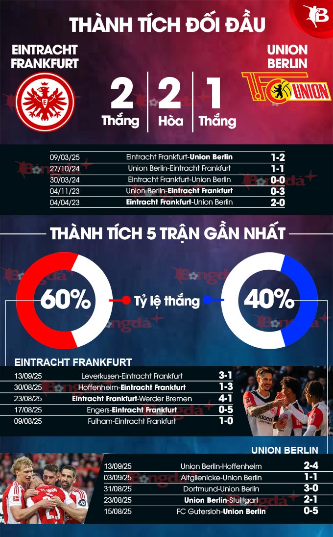 - Nhiều bàn thắng cả trận: Cả 5 trận chính thức từ đầu mùa giải của Frankfurt đều kết thúc với ít nhất 5 bàn thắng được ghi. 4 trận đã đấu của Union Berlin cũng xuất hiện từ 3 bàn thắng trở lên.