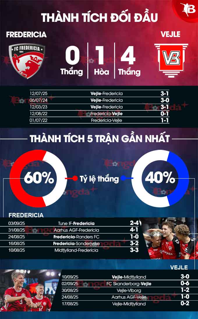 Xét về thành tích đối đầu, Fredericia chắc chắn không được lịch sử ủng hộ do họ thường xuyên phải nhận kết quả không như ý trước Vejle. Bằng chứng là Fredericia đang có chuỗi 4 trận thua liên tiếp dưới tay Vejle. Nếu nhìn rộng hơn, họ đã không thắng Vejle trong 8 trận suốt từ năm 2020 tới giờ.